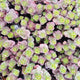 Feuilles coriaces à marges dentées, rouge foncé sur fond vert pourpré. Succulentes, en forme de petit coussin dense.