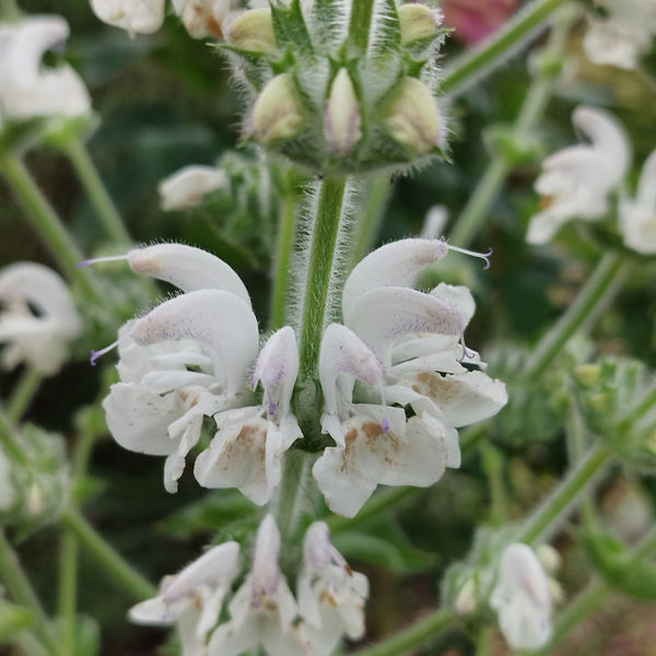 Rosette de larges feuilles persistantes aromatiques, couvertes de longs poils argenté, devenant blancs en été.