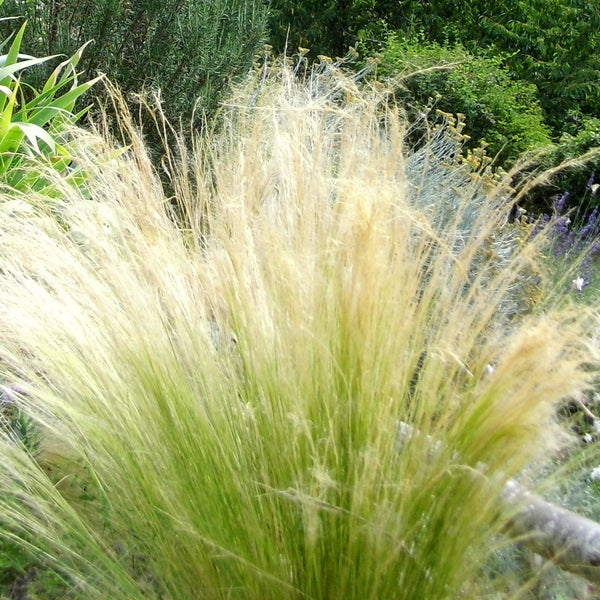 Touffe dense de feuilles persistantes souples et filiformes, vert frais, devenant dorées en automne et en hiver.