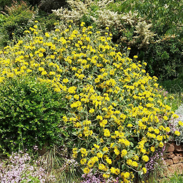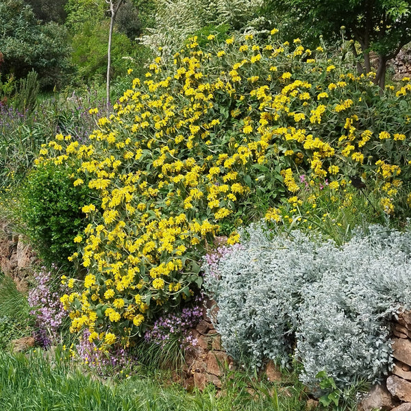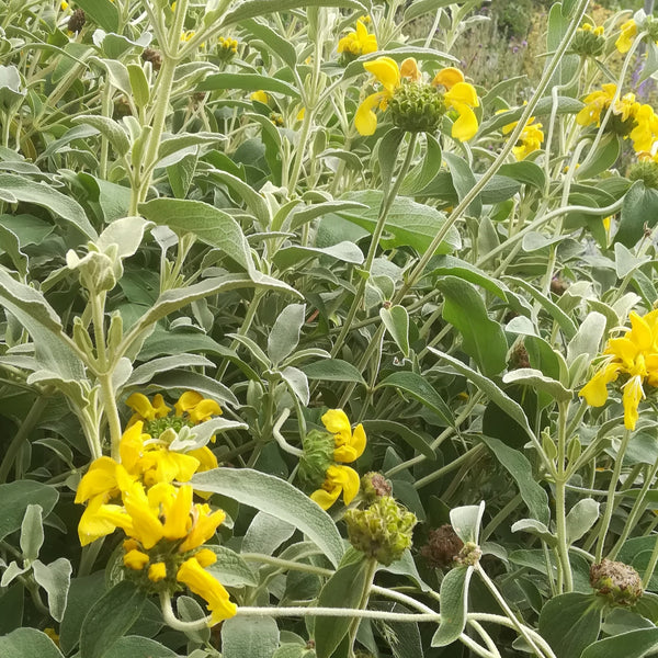 Feuilles persistantes gris vert à revers blanchâtre, duveteuse, forme une masse arrondie.