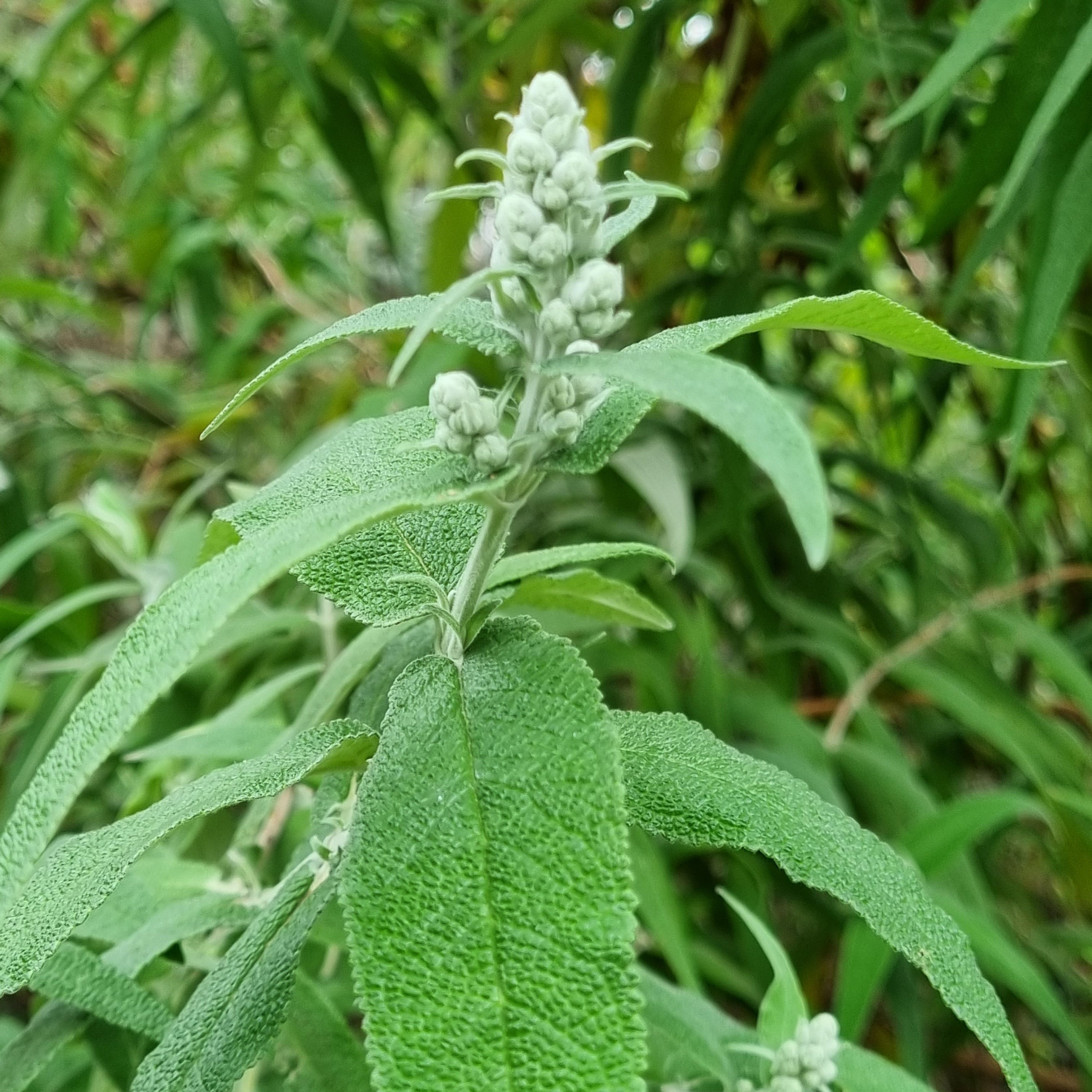 Feuilles persistantes rugueuses, vertes à revers duveteux argenté.